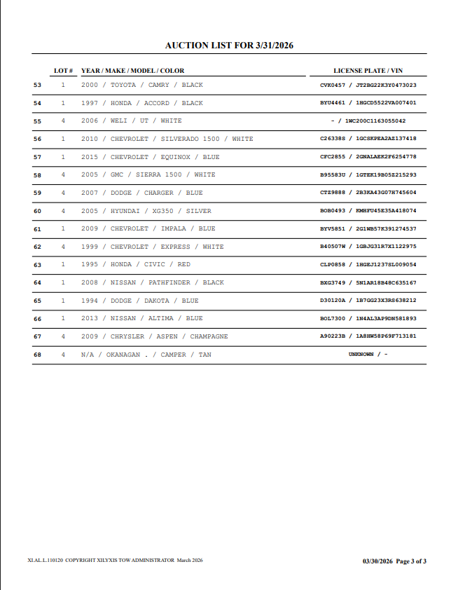 - All vehicles must be removed from the property before 2 P.M. the day of the auction unless otherwise Pre-arranged with management. All unclaimed vehicles will be impounded as an abandoned vehicle at the winning bidders risk and expense.